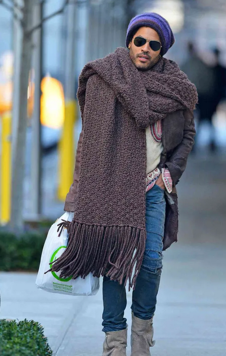 It’s the first day of “Fall”. You are Lenny Kravitz and you are leaving the house. You reach your door then remember. You stop. You turn around and head back upstairs and you enter your walk-in wardrobe. You walk past the hundreds of leather pants you own. You know what you need. You need your giant scarf. You find it hanging behind some more leather pants. It is brown. Enormous. Comically large. You heave it out of the wardobe. It is incredible impractical but you know that it brings happiness to others. They see you in the scarf and at first they think “what the fuck is that guy wearing? Is it a blanket?”. Their minds race: “Why would you make a scarf that big?” Then they look closer and see it’s you, Lenny Kravitz. Sometimes they say “Fuck! It’s Lenny Kravitz!” Other times they say “Is that you? Lenny Kravitz”. You smile beatifically upon them. “Yes, I’m Lenny Kravitz,” you say gently. You touch their forehead, blessing them: “And this is my big fucking scarf”.