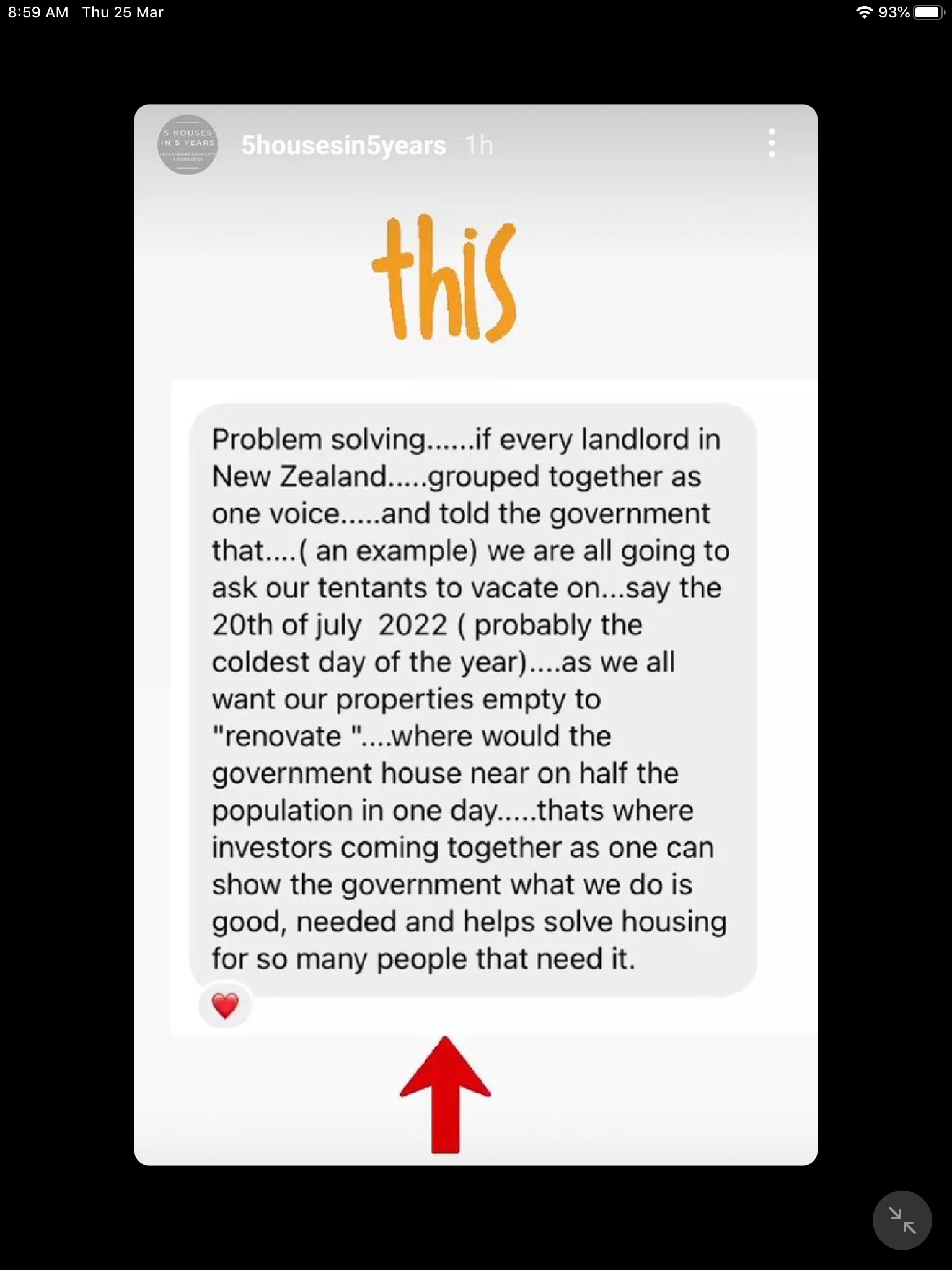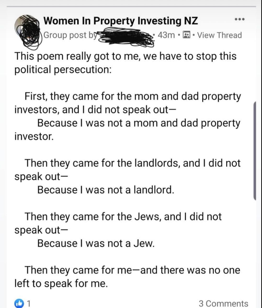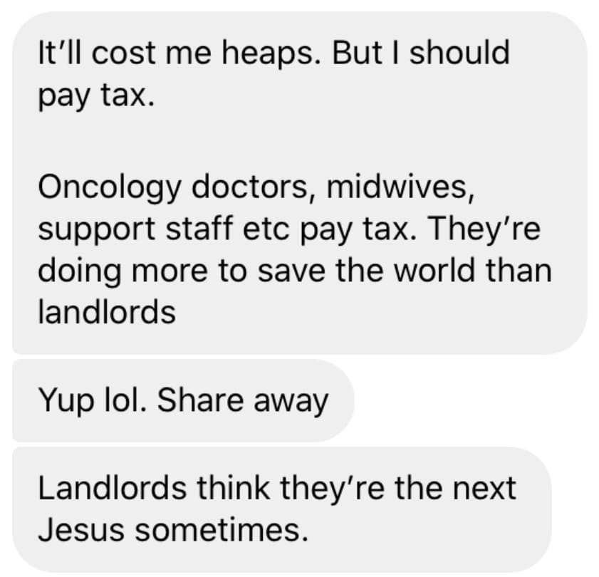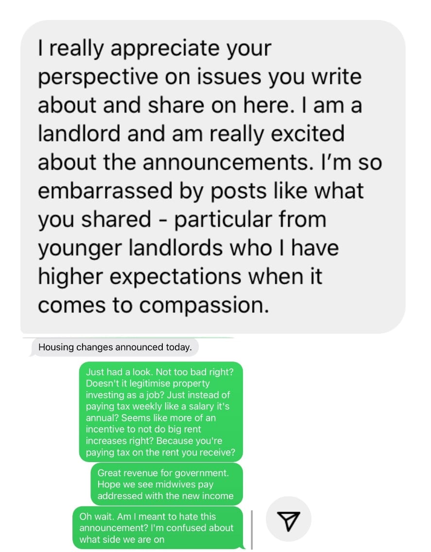 I would also like to say as a palate cleanser - I’ve had so many messages like the one below this week. I know it feels utterly mind-boggling as a renter to be reading the comments of property investors, but - hope is on the horizon. And I know you’re scared your landlord will put up the rent, and you know they probably well and I wish I could work out a way to stop that happening…but…please know I’ve had a few messages from landlords saying they welcome the changes and will not be increasing rent. Hopefully these landlords can speak out publicly so others know there’s another way you can choose to be. You can treat your tenants like human beings not ATM machines. You can recognise that just like everyone else you have to pay tax. You can stop expecting families with so much less than you to subsidise your income! Who knew?!