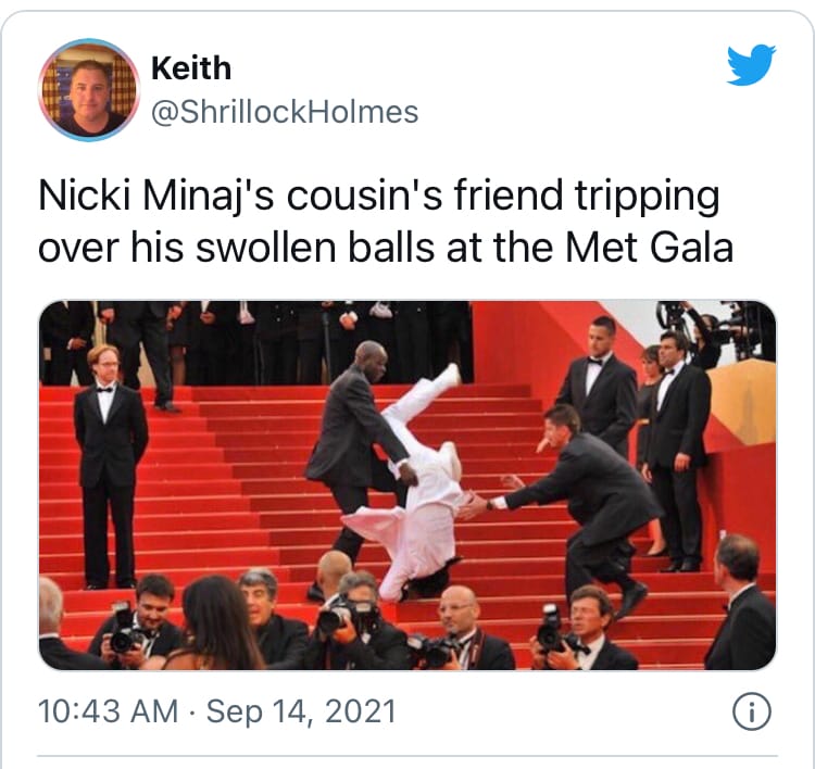 In all seriousness, I’m quite sure Nicki Minaj posted about her cousin’s friend’s big vaccine balls to distract people from the fact her husband, Kenneth Petty, pleaded guilty to failing to register as a sex offender in California last week. And now he’s potentially facing up to 10 years in jail. Here’s a good piece on all of the wild things she’s said about the White House, swollen nads, and Drake.