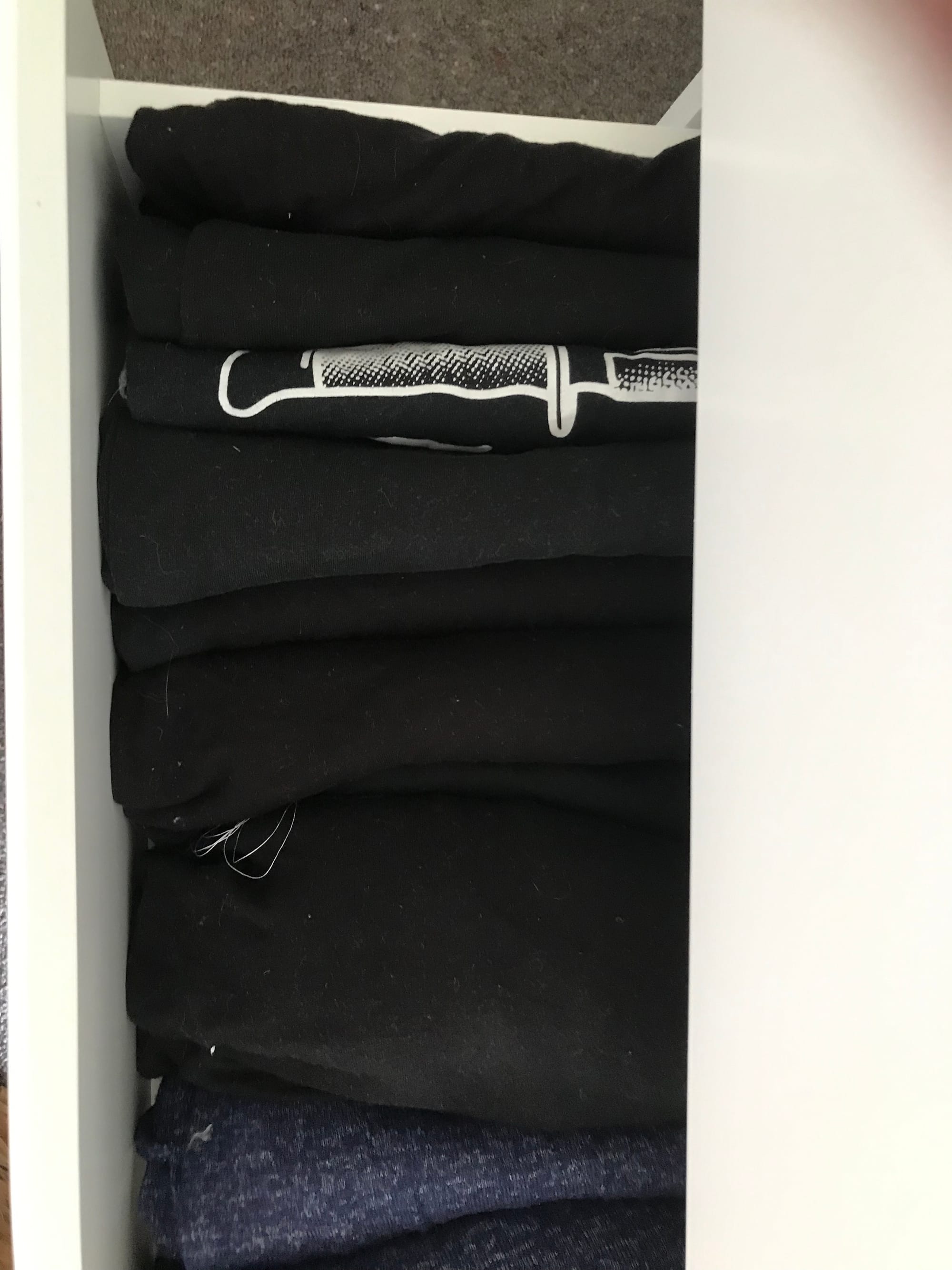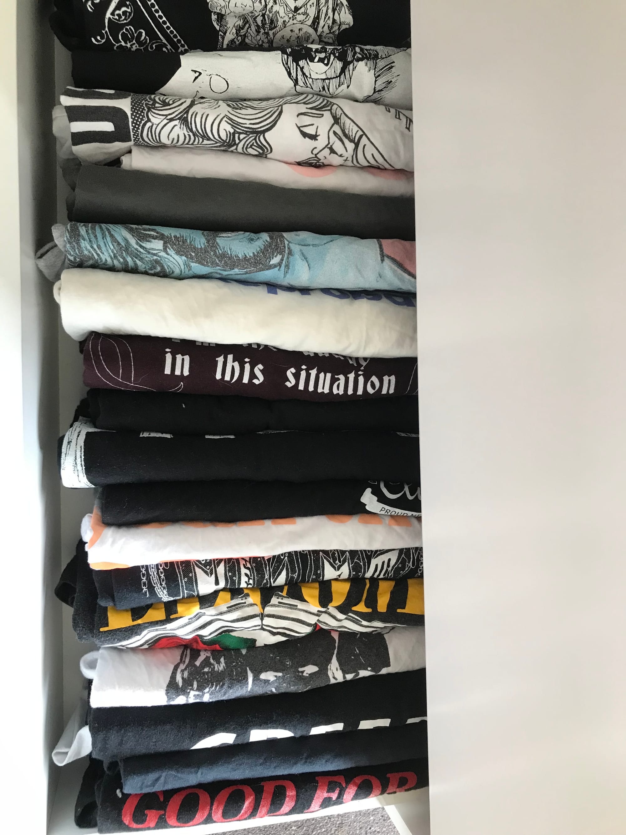 T-shirts can be tough because we wind up with so many. Keep the ones you love the most, don't keep more than a couple as “sleep shirts”, give yourself the gift of not keeping that awful corporate-branded shirt you got in a swag bag eight years ago. Throw away any that have Smell. What's Smell? Come on, you know it, that awful experience of putting on a clean t-shirt only to discover mid-morning that your fresh sweat has revived, zombie-like, something embedded in the pits of your shirt. Soaking in Napisan only does so much.