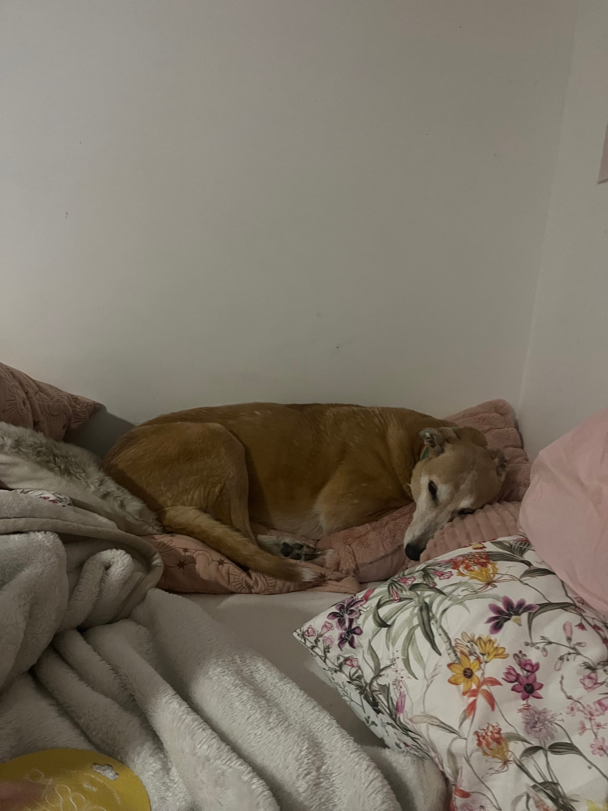 I looked at my empty bed. I squeezed my eyes shut and tried to imagine her on the bed. I tried to imagine her tight in a ball, pretending she wasn’t a 30kg plus greyhound. I tried to imagine her collar tinkling, tried to imagine her sighing, tried to imagine her honey coloured ears, tried to imagine the way she would bump into my arm for my pats.