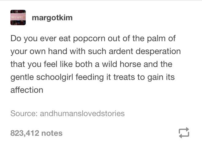 - Desperately manifesting an attention span while sitting at my dining table desk set up because the work doesn't stop. Sometimes shovelling popcorn into my mouth keeps my brain going.